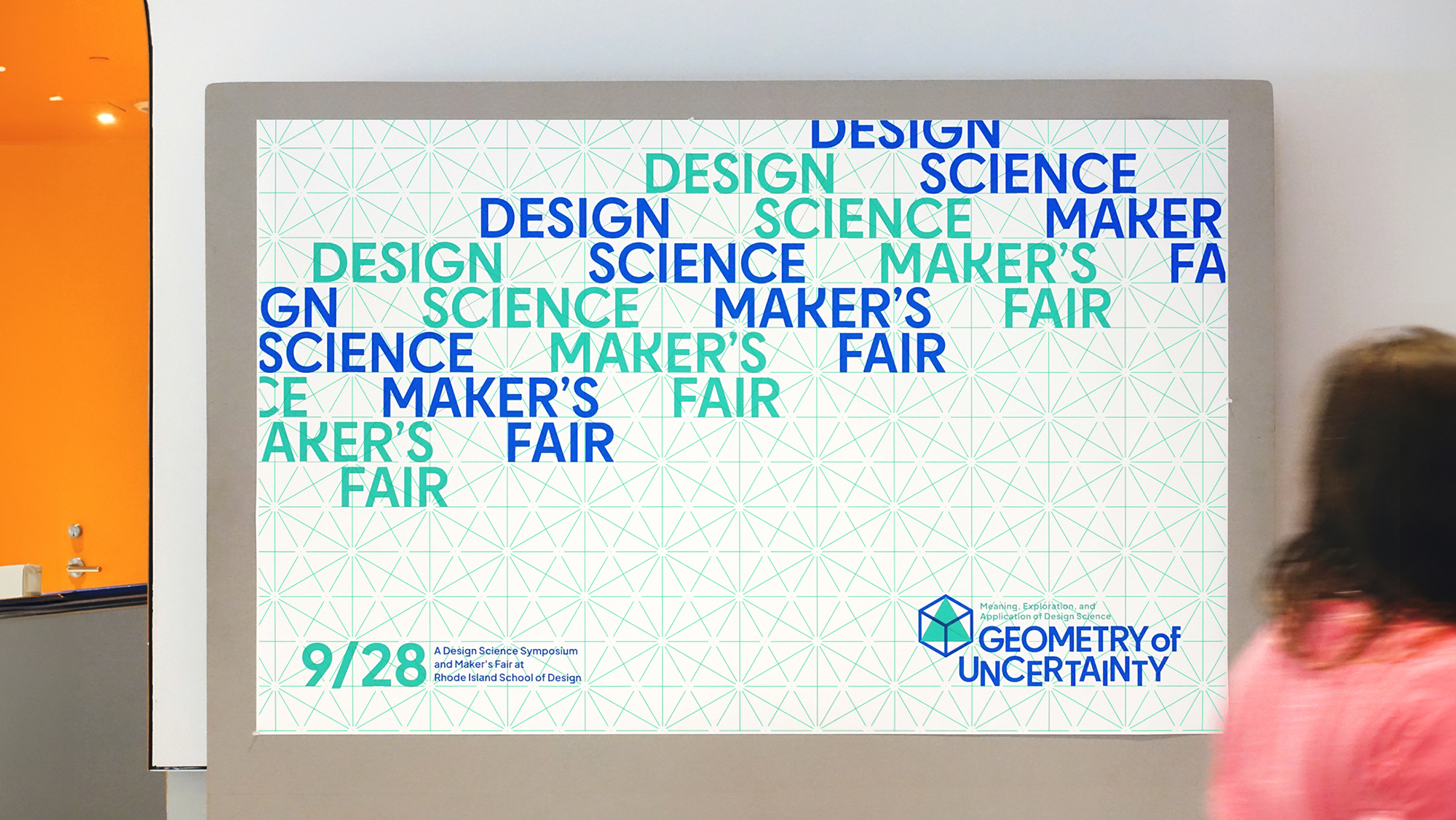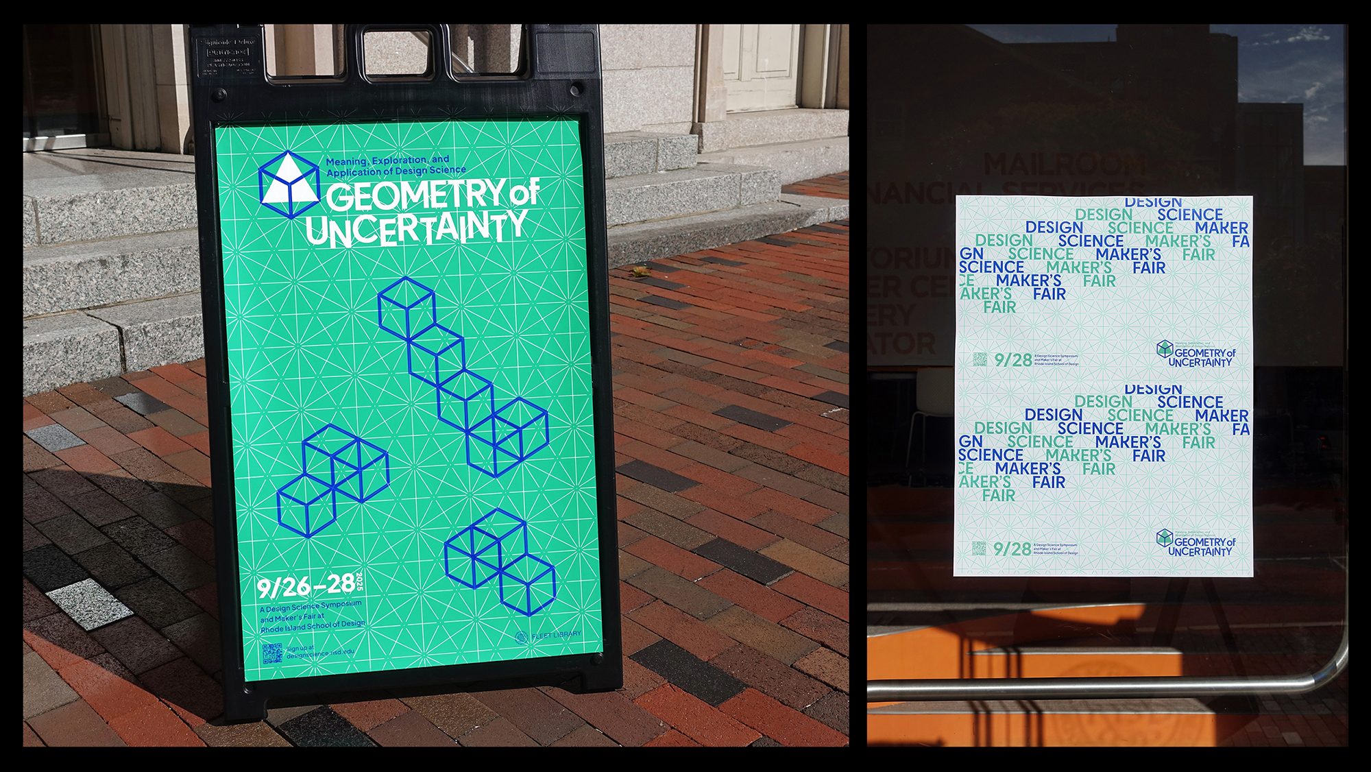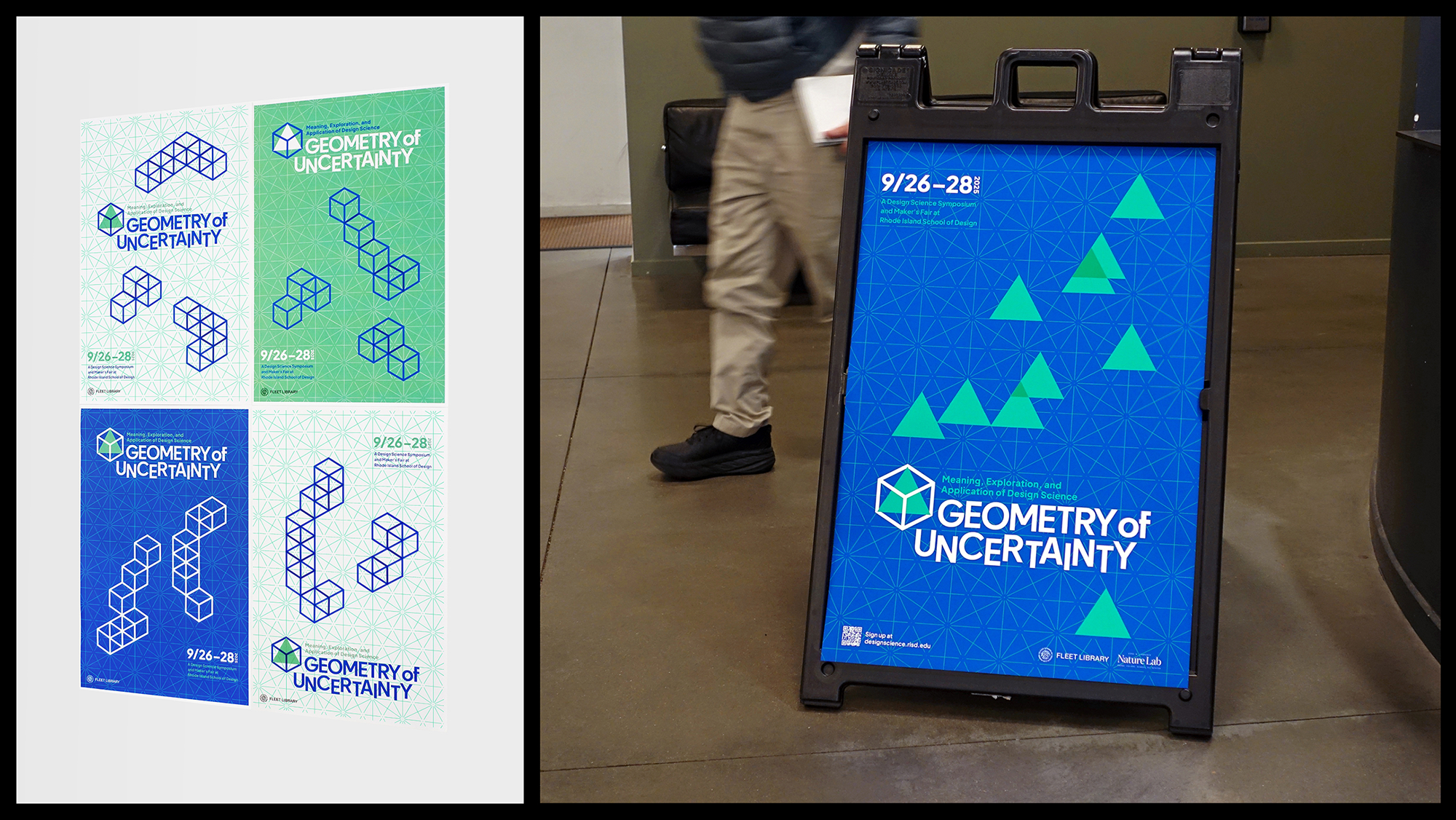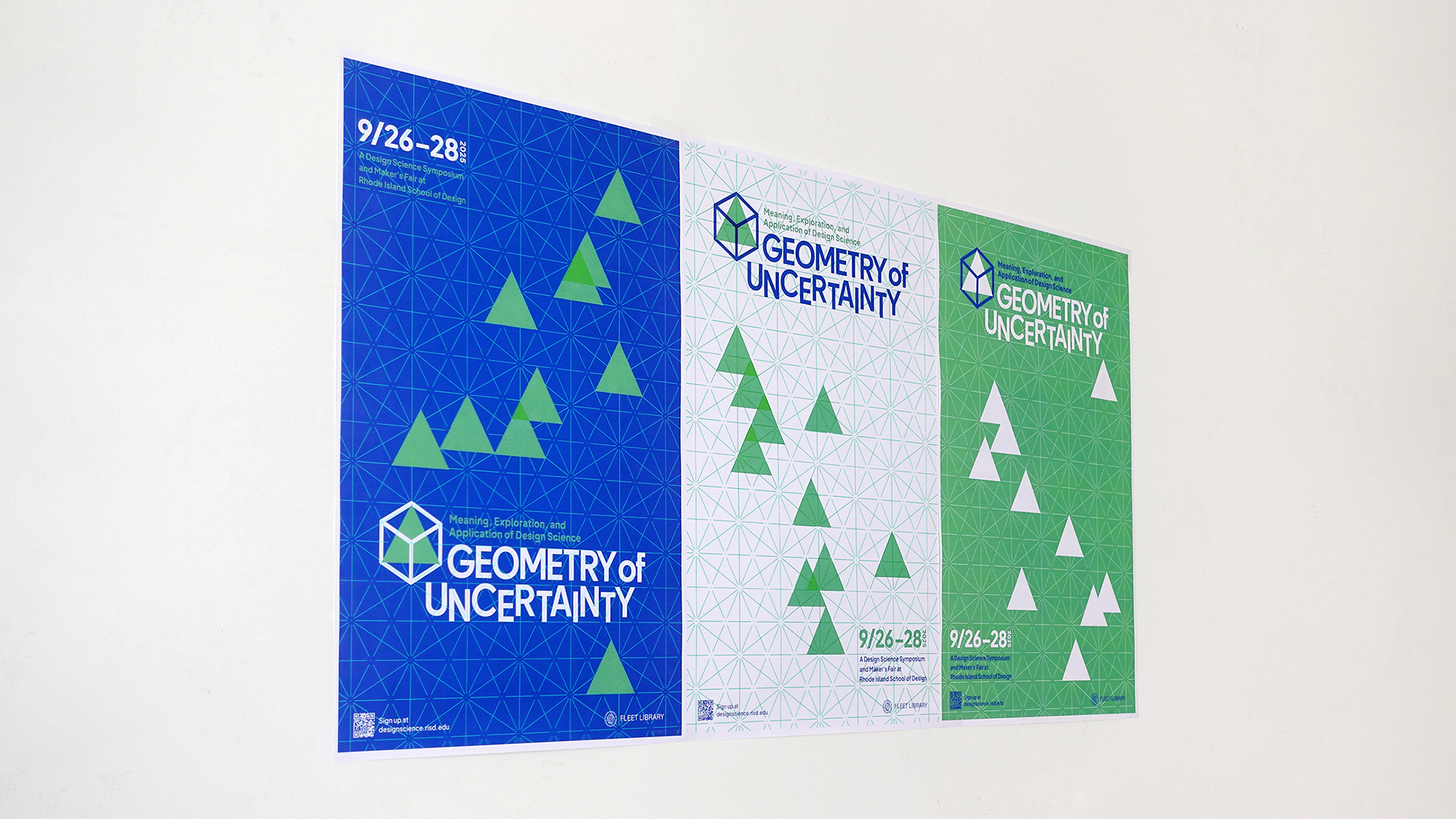 Framing uncertainty as an impetus for creativity, RISD’s design and science symposium, Geometry of Uncertainty, explores visual mathematics and the role of geometry in art and design. Inspired by mathematical diagram and tessellation, this identity combines both grid system and modularity. Using tetrahedron and hexahedron as the logo. Their flexible combinations creates order and precision in a dynamic design system.