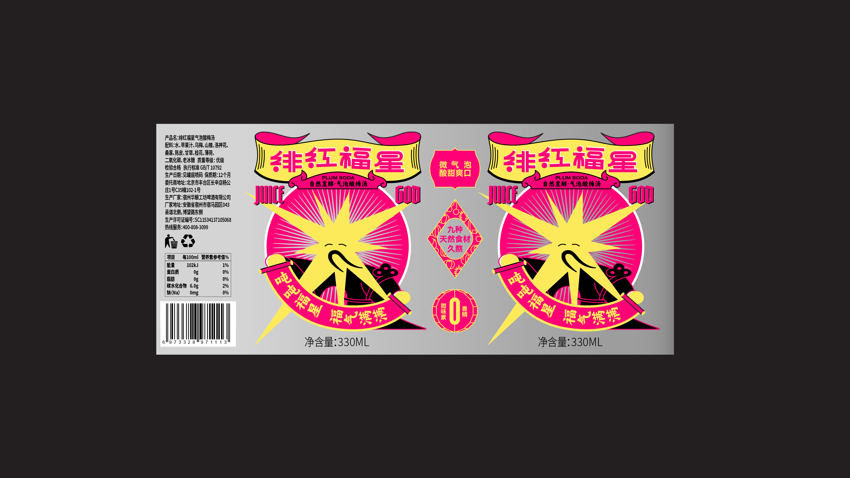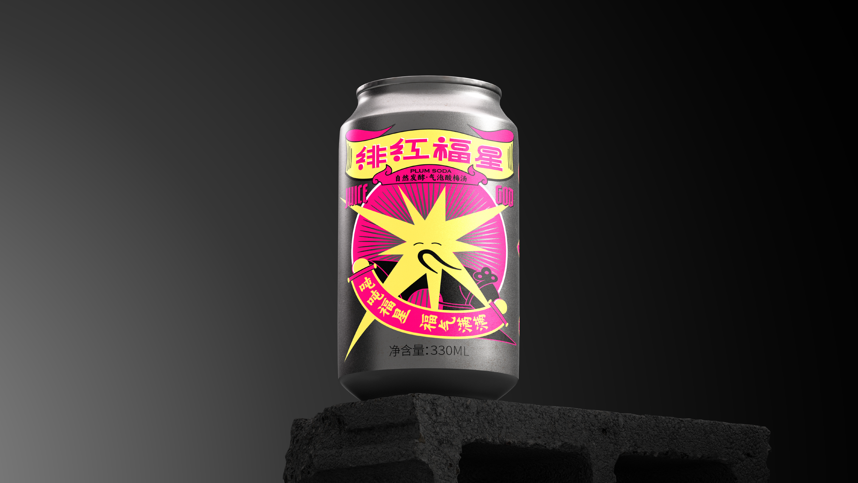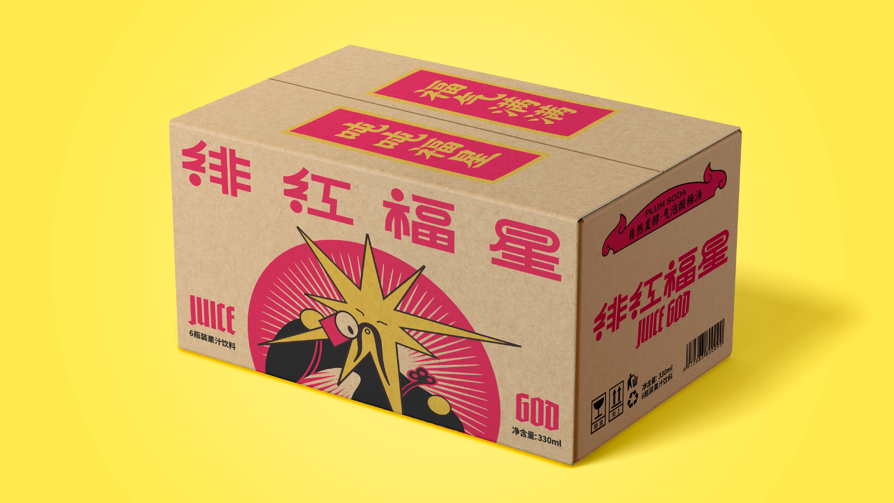 Crimson Lucky Star, or Juice God is a fizzy plum soda that puts a modern twist on the traditional recipe of Chinese sour plum drink (酸梅汤). We design an auspicious lucky star character based on the Chinese god of luck.